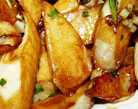 4.锅内留油少许,再将茭白放入,加味精、糖、酱油、酒、水适量小火焖煮3分钟;