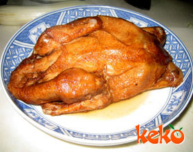 德州扒鸡:'1.在活鸡脖下宰杀褪毛,剥去脚爪上的老皮,在鸡腹下近肛门处横开3.3厘米长的刀口,取出内脏、食管,割去肛门,用清水冲洗干净,将鸡的左翅自脖下的刀...