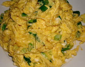 2.炒勺置旺火上,加花生油烧至六成热,倒入蛋液翻炒至熟,装入平盘即可。