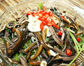 4.将黄鳝丝也用沸水烫后放在三丝上,再浇上制好的汁,撒上胡椒粉、干辣椒末、红辣椒末、花椒末,浇上烧热的香油即成。