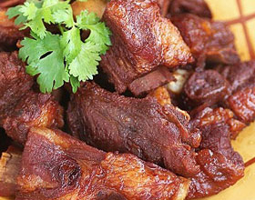 梅子蒸排骨:'1.将排骨斩成10克重的块,洗干净,控去水分;2.把以上味料与排骨拌匀,摊放盘中;3.再浇适量花生油,用中火蒸约10分钟至熟,取出便成。...