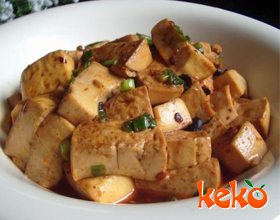 2.豆腐块放入油锅炸成金黄色捞出,沥油;原锅留油少许,烹入酱油,放入豆豉、蒜片、精盐、味精煸炒出香味,放入豆腐翻炒均匀,出锅即可。