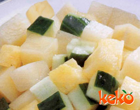 菠萝土豆丁:'1.将菠萝去外皮,洗净,切成小丁,放入盐水内略泡,捞出控水;2.土豆洗净,煮熟,去皮,切成小丁;3.黄瓜洗净,切成小丁;4.将菠萝丁、土豆丁、黄瓜丁...    详细介绍