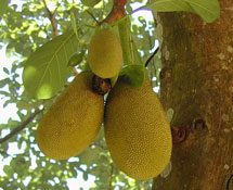 菠萝蜜是一种热带桑科常绿乔木,原产印度,引入中国栽培已有九百多年历史,分布在海南、云南、台湾等热带地区。果实6~7月成熟,果实巨大,最重达40公斤,被称为水果之王。果实结于树干,内藏无数金黄色肉包,肥厚柔软,清甜可口,香味浓郁。当地年轻人约会前会将其当作口香糖咀嚼几口,可以改变口腔异味,另外还有健体益寿的作用。此树树龄愈大,果也愈大,木材也愈坚硬。