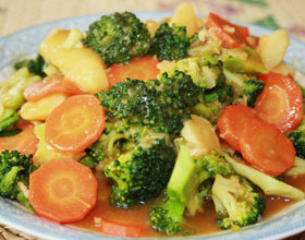 5.用2大匙油先将土豆炒过,并加水煮熟,放入所有材料炒匀,然后盛出,另用1大匙油炒咖喱粉和其他调味料并加1杯清水,再将各色蔬菜回锅烧入味;