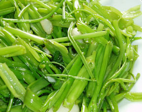 蒜拌空心菜:'1.将空心菜择去老根,切10厘米长的段,放开水中焯一下,捞出控干水分,晾凉待用;2.将蒜剥去皮,洗净剁成茸状,与酱油,醋,香油一起拌匀,浇在空心菜...