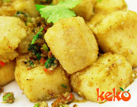 脆豆腐:'1.将每块豆腐干切成6片;2.将鸡蛋打散,放入酱油、精盐、胡椒粉、辣椒酱拌匀;3.将青、红椒洗净放开水中焯一下;4.豆腐干片放入加调料的鸡蛋液中,每...    详细介绍