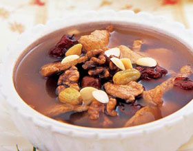 三子核桃肉益发汤:'1.女贞子、覆盆子、菟丝子分别洗净;2.核桃去壳略捣碎;3.瘦肉洗净原件下锅;4.全部材料共置瓦煲,加水8碗,煲至出味;5.加姜、盐调味,去渣,即可饮...    详细介绍
