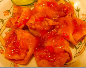 凉拌馄饨:'1.取黑醋加入糖用冷开水稀释;2.取芝麻酱加少许盐和冷开水用筷子调匀;3.将馄饨煮熟后放到碗中冷透;4.将馄饨盛入盘中加入调好的醋,再浇点芝麻酱、红...    详细介绍