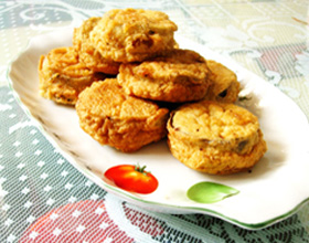 3.锅内注油烧热,下茄饼炸于金黄色,捞出装盘即可。