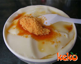 4.将豆腐花盛入碗内,浇上调料,淋上辣椒油,即可食用。