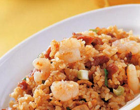 13.将饭的2/3 分装盛入小碗后,将余下的浇头和虾仁、豌豆、葱末10 克倒入锅内,同锅中余饭一同炒匀,盛放在碗内盖面即成。