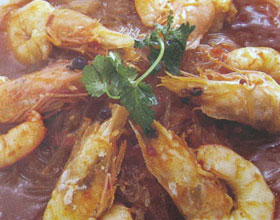 明虾烧粉丝:'1.将明虾去壳、尾、肠线,放入热油锅内炸至红色捞出。2.粉丝用热水泡发至软后待用;锅内注油烧热,加香辣酱、姜、蒜炒香,放入高汤、粉丝捞起装盘,汤...