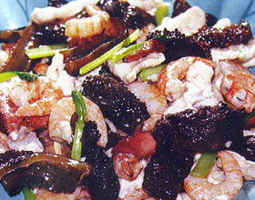 炒原汁虾仁:'1.大青虾淘洗干净,挤出虾仁;2.海参泡发洗净切小丁;3.淀粉(20克)放碗内加水调成湿淀粉(40克);4.葱、姜切细末;5.将鸡蛋清、湿淀粉、精盐放入碗...