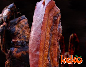 3.烘焙:腊肉坯腌制出缸后,即可开竹。每根竹竿可挂5千克左右,送入烘房。竹竿要排列整齐,每竿距离相隔2至3厘米,进烘房后应立刻将石棉布帘放下。烘房温度保持在45至50℃,温度开始高,而后逐步降低,正确掌握烘房温度是决定成品品质的关键。操作人员经经常检查肉坯的干湿程度,如温度过高,火力太旺,则滴油过多,影响成品率。如温度过低,则容易发生酸味,而且色泽发暗,影响质量。烘焙时应分清级别,以防混淆。腊肉坯进烘房经14小时左右,视条坯干燥情况即可升至第二层继续烘焙。升层时里外竹竿相互调换位置,使条坯受温均匀,再经24小时左右即可出房。成品出房时须掌握先进后出,分清级别,分批出房。并检查是否干透,如发现外表有杂质,白斑、焦斑和霉点等现象时,应剔出另外处理。