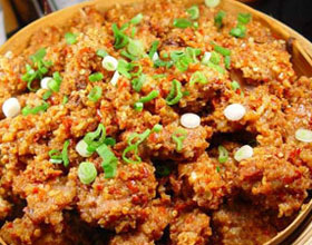 宫保鸡丁:'1.鸡去骨,切成1厘米见方的碎丁,用鸡蛋清、盐10克、生粉10克腌拌均匀。2.色拉油入锅烧热,鸡丁下锅炸熟,捞起沥油。3.锅中留油少许,香干辣椒段、蒜...    详细介绍