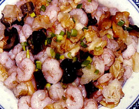 炒虾螺海:'1.水发海参切2厘米大丁,沸水焯出;活海螺洗交,剞十字花刀,切1.2厘米的丁;鲜虾仁用盐、味精、半个蛋清、水淀粉抓匀,腌渍冲击波;珍菇用开水焯过。...