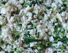 炒虾粒豆腐:'1.将虾去头、皮洗净,切0.8厘米的粒;2.豆腐剁泥,加鸡蛋、凉高汤50克、盐、味精、胡椒粉调匀,放植物油中炒至九成熟;3.韭菜择洗干净切成末;葱姜洗...    详细介绍