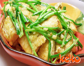 豆腐炒韭菜:'1.豆腐切丝,韭菜洗净切段。2.滑勺中加植物油,烧热,加入豆腐丝煸至表皮稍硬,呈浅黄色时用手勺推至勺的一边,即将韭菜放油中煸炒,再加盐、味精与豆...    详细介绍