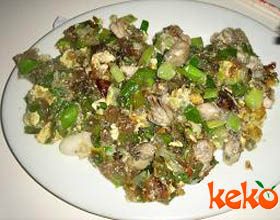 妗子炒蛤蛋:'1.蛤蜊洗净放开水中一烫取出,原汤滗出备用;将蛤仁剥出,放原汤中浸泡备用。2.韭菜、茼蒿洗净切末,豆腐切细丝。以上三料放入鸡蛋液中加少许精盐、胡...    详细介绍